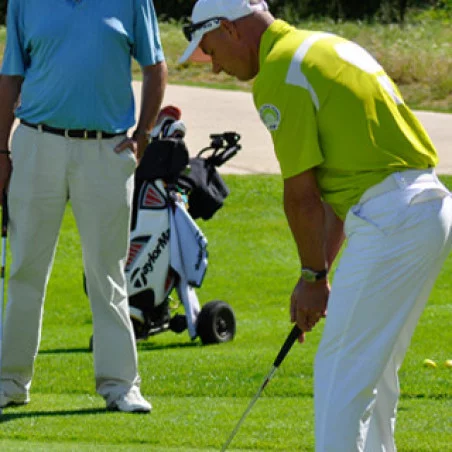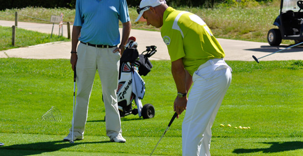 Présentation du stage autour d’un café d’accueil, échauffement spécifique au golf, analyse du niveau du joueur, posture, grip et alignement, explication de la mécanique du swing au putting, approches et grand jeu.