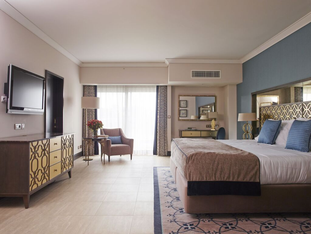 Suite Junior : Comprend une chambre avec lit King-size, un salon séparé, un balcon privé avec vue sur les jardins ou l’océan, une salle de bain en marbre, climatisation, minibar, Wi-Fi et télévision.