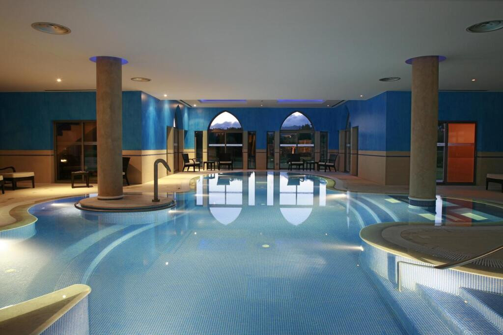 Bien-être : Spa avec sauna, piscine intérieure chauffée, bain turc et salle de sport. Deux piscines extérieures entourées de jardins luxuriants sont disponibles en été.