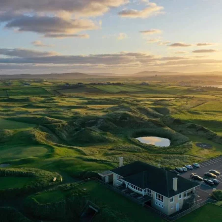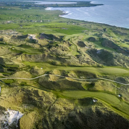 Le parcours Wild Atlantic Dunes se distingue par ses paysages époustouflants et son design audacieux. Classé numéro 12 en Irlande, il est réputé pour être l'un des parcours de liens les plus spectaculaires du pays, offrant une expérience de golf brute et authentique. Les trous se faufilent à travers des dunes impressionnantes, créant des défis visuels et techniques qui captivent les golfeurs et leur offrent une immersion totale dans un environnement naturel grandiose. Le terrain est à la fois rugueux et magnifique, accentuant l'aspect sauvage du golf à liens.