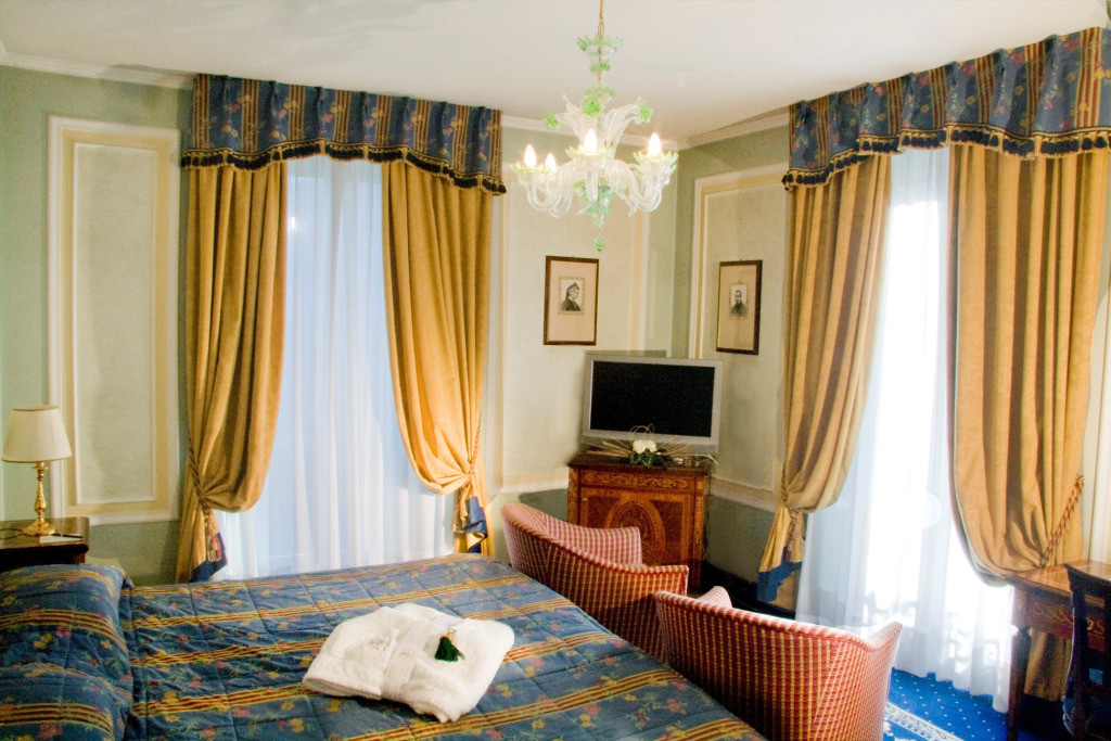 L'hôtel séduit par son style Belle Époque, avec sa façade imposante, ses balcons en fer forgé et ses intérieurs richement décorés. Les salons et chambres sont ornés de fresques, de lustres en cristal et de meubles d'époque, plongeant les hôtes dans une atmosphère digne des plus grands palaces du XIXe siècle. Le jardin luxuriant, agrémenté de statues et de fontaines, renforce encore le charme de cet établissement.