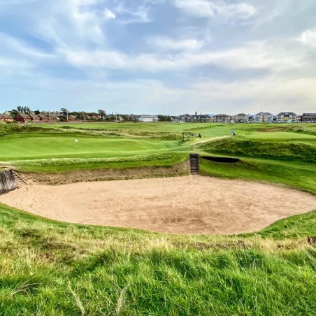 Prestwick Golf Club se distingue par un tracé atypique et profondément authentique. Contrairement aux links modernes, le parcours présente des fairways étroits, des greens souvent surélevés et des bunkers spectaculaires, parfois très profonds, devenus célèbres dans l’histoire du golf. Chaque trou possède une identité forte, demandant précision, créativité et une excellente lecture du terrain. Ici, le golf se joue au sol, en tenant compte du vent et du relief naturel.