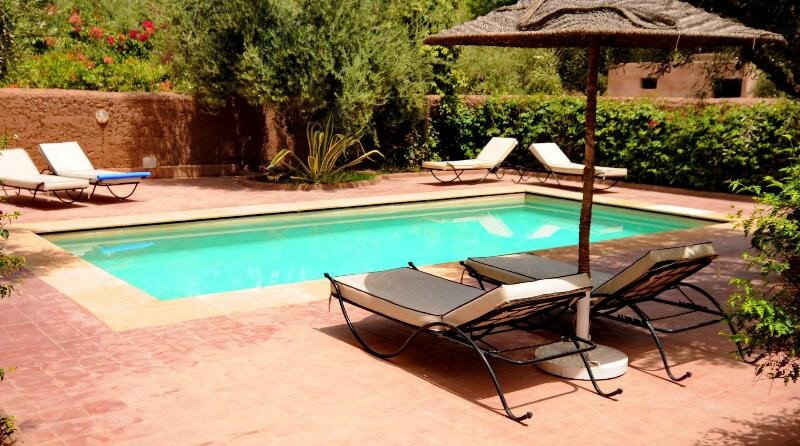 Les chambres et suites spacieuses sont décorées avec soin dans un style marocain traditionnel, agrémenté d’équipements modernes. L’établissement propose plusieurs catégories : chambres standard avec vue sur les jardins ou la piscine, suites junior avec salon et terrasse privée, et suites avec piscine privée pour plus d’intimité. Chaque logement comprend climatisation, télévision à écran plat, salle de bain avec produits locaux, Wi-Fi gratuit, et certaines chambres disposent d’un balcon ou d’une terrasse.