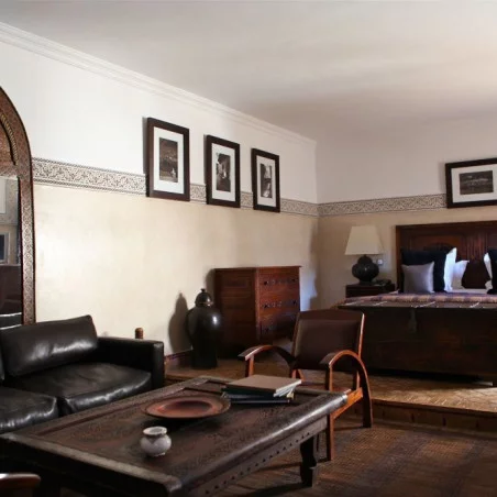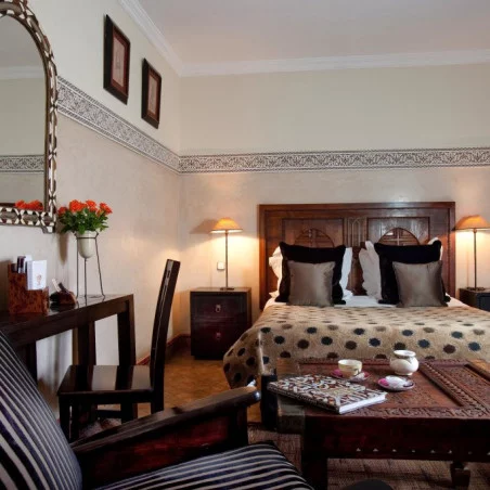 Les chambres et suites sont décorées dans un style marocain raffiné, avec des matériaux nobles. Les chambres Deluxe offrent une vue sur les patios ou la piscine, les suites Junior disposent d’un coin salon et d’une terrasse, et les Suites Royales proposent des espaces généreux avec salons séparés et terrasses privées.