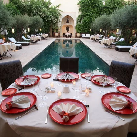 L’hôtel organise visites guidées, excursions dans le désert d’Agafay et les montagnes de l’Atlas, ainsi que des cours de cuisine marocaine pour une immersion culturelle complète.