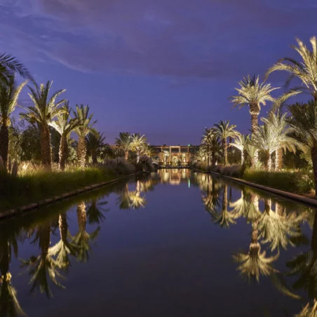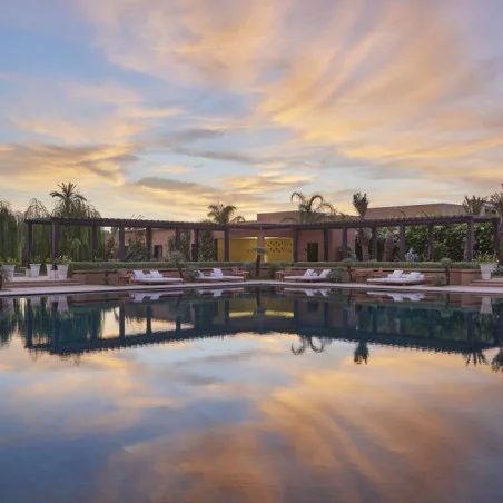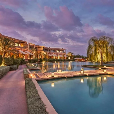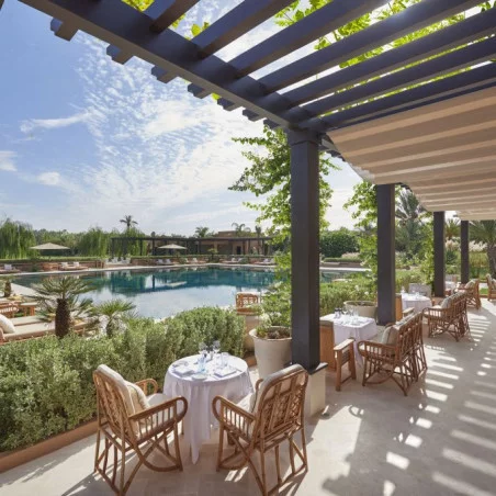 Route Du Golf Royal, Marrakech - 40000 - Marrakech - MarocLe Mandarin Oriental, Marrakech est un hôtel de luxe situé à quelques minutes du centre de Marrakech, niché au cœur de 20 hectares de jardins luxuriants et de vergers, avec une vue splendide sur les montagnes de l'Atlas. Connu pour son architecture mêlant styles marocain et oriental, cet hôtel 5 étoiles offre un cadre raffiné pour une expérience de détente totale, avec des villas privées, un spa exceptionnel et un accès facile aux parcours de golf de Marrakech.