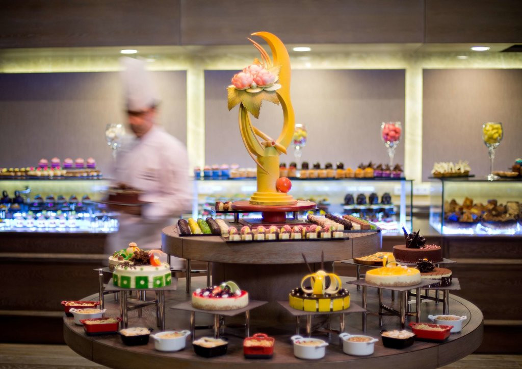 - Mythos : Le restaurant principal de l’hôtel, servant des buffets variés pour le petit-déjeuner, le déjeuner et le dîner, avec des stations de cuisine en direct.