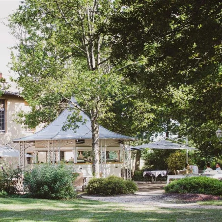 Le restaurant sert une cuisine traditionnelle française avec des produits frais et locaux dans une ambiance conviviale. Les repas peuvent être dégustés en terrasse, offrant une vue sur le golf et les jardins, idéale pour se détendre après une journée de golf.