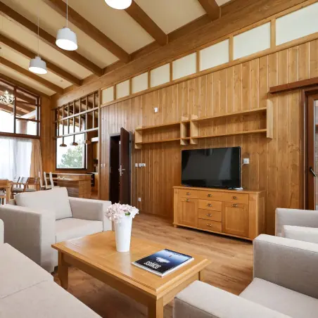 Les appartements du Pirin Golf & Country Club offrent une expérience de séjour pratique et luxueuse pour les golfeurs. Ils sont entièrement équipés et décorés dans un style moderne et élégant, tout en intégrant des touches de bois et de pierre, pour rappeler l’authenticité et l’élégance des chalets alpins.