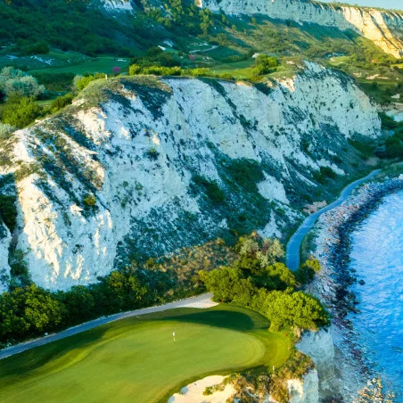 Thracian Cliffs est installé sur un domaine naturel spectaculaire, où de gigantesques falaises blanches plongent dans une mer d’un bleu profond. Gary Player lui-même décrit le site comme “le plus incroyable terrain sur lequel j’ai jamais construit un golf”. Le panorama est constant : depuis chaque trou, le joueur se retrouve face à l’immensité de la mer, avec une lumière et une atmosphère uniques. C’est un parcours où la nature est souveraine : vent marin, falaises brutes, relief abrupt, silence et perspectives infinies accompagnent chaque coup.