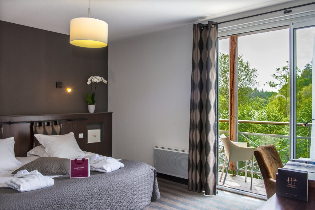 La chambre prestige est encore plus luxueuse, avec une salle de bain privée comprenant une baignoire et une douche séparées, un lit king-size, minibar, peignoirs, chaussons et vue panoramique sur le golf ou la rivière.