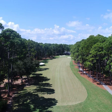 Le parcours traverse un environnement authentique composé de pins élancés, de chênes centenaires et de lagunes qui serpentent entre les trous. Les zones humides bordant plusieurs fairways demandent une bonne gestion des trajectoires, surtout lorsque le vent s’invite dans la partie. Les transitions entre les trous se font au cœur de couloirs boisés, renforçant le caractère paisible et immersif du parcours. La faune locale — oiseaux, tortues, petits animaux — accompagne discrètement les golfeurs, rappelant la richesse naturelle de Hilton Head Island. La lumière changeante au fil de la journée sublime les couleurs du parcours, en particulier autour des étangs et des greens surélevés.