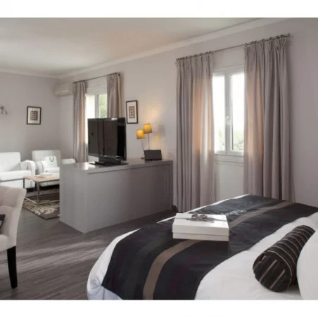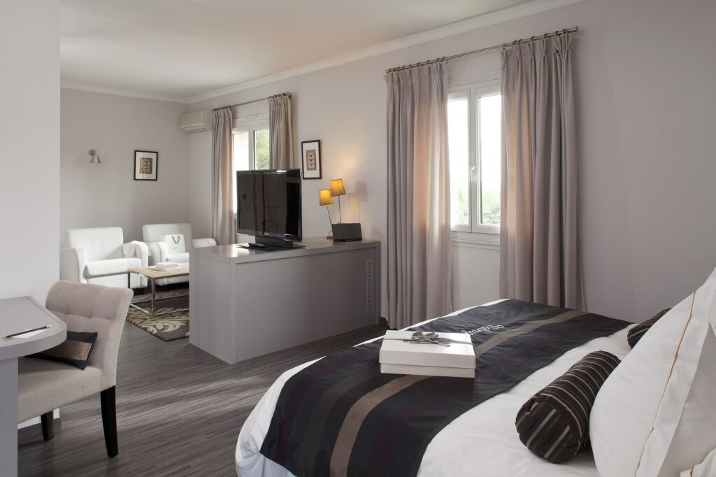 - L'hôtel propose 48 chambres et suites somptueusement décorées, alliant élégance classique et confort moderne. Les chambres sont équipées de lits king-size, de salles de bains en marbre, d'une connexion Wi-Fi gratuite, d'une télévision à écran plat et de mini-bars. Certaines suites disposent de terrasses ou balcons privés avec vue sur les Alpilles.