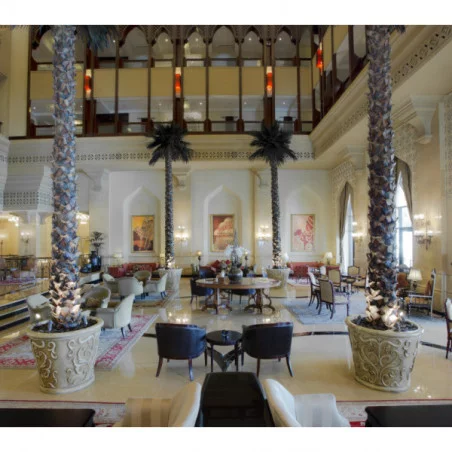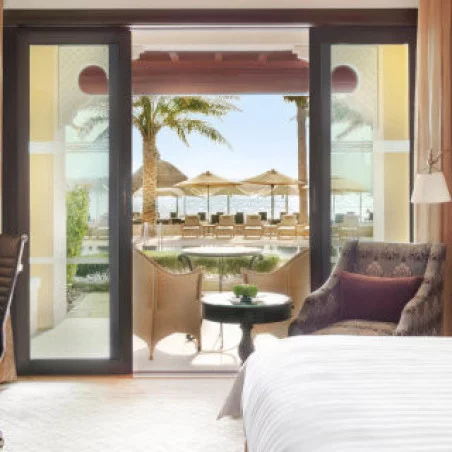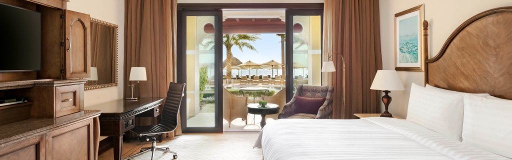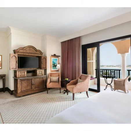 Chambre Deluxe : D'une superficie de 45 à 55 m², cette chambre spacieuse est décorée dans un style arabe moderne avec des couleurs chaudes et un mobilier élégant. Elle dispose d'un balcon ou d'une terrasse offrant une vue sur le jardin ou le golfe Persique.