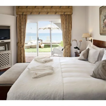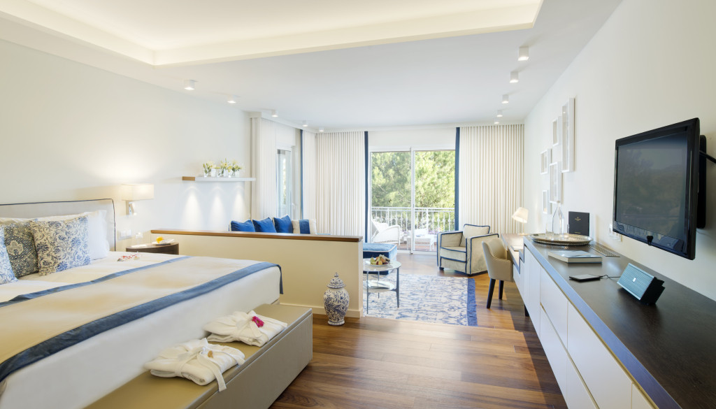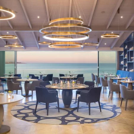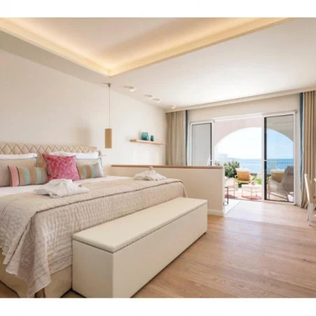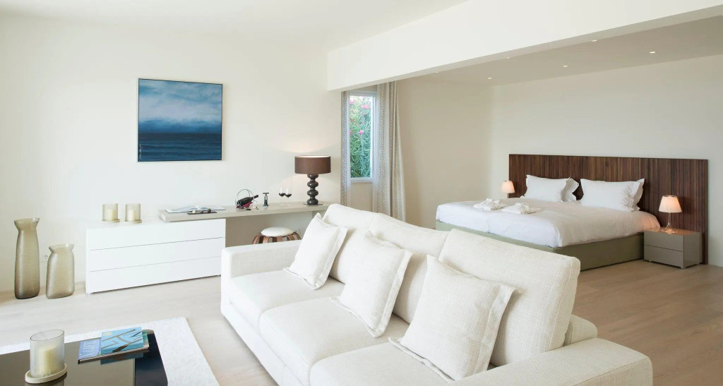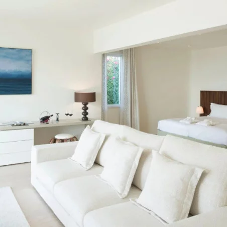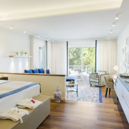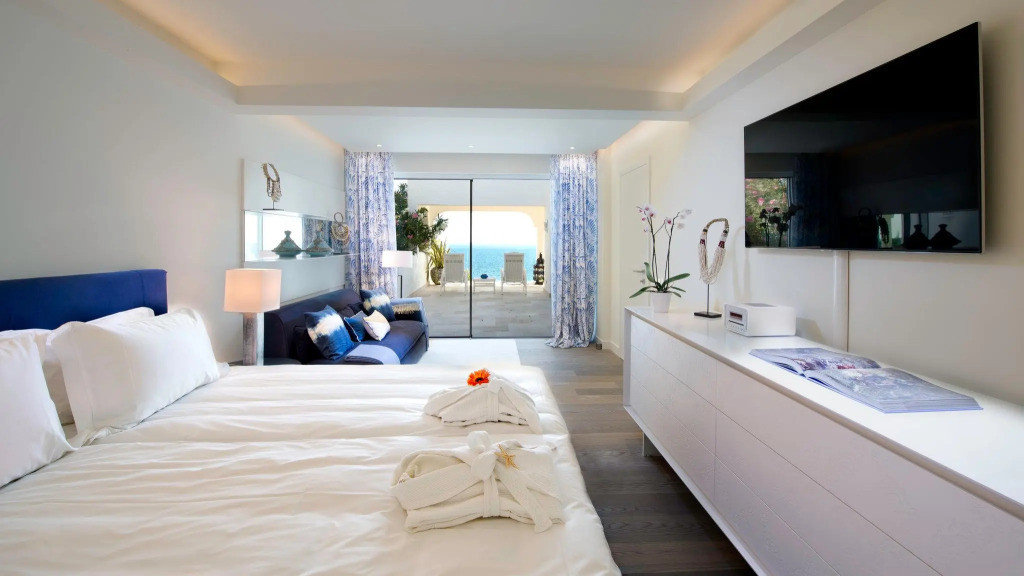 Les chambres Deluxe (40-45 m²) allient design contemporain et touches méditerranéennes, avec lits King-size ou jumeaux, salle de bain avec baignoire et douche, et balcon ou terrasse panoramique. Les Suites Junior (52 m²) offrent un espace supplémentaire grâce à un coin salon et une terrasse privée avec vue dégagée. Pour les familles, les Suites Familiales (80 m²) proposent deux chambres séparées et un grand espace de vie. Les villas privées, avec 2 à 5 chambres, disposent de cuisines entièrement équipées, piscines à débordement et jardins privatifs, parfaites pour des séjours exclusifs.