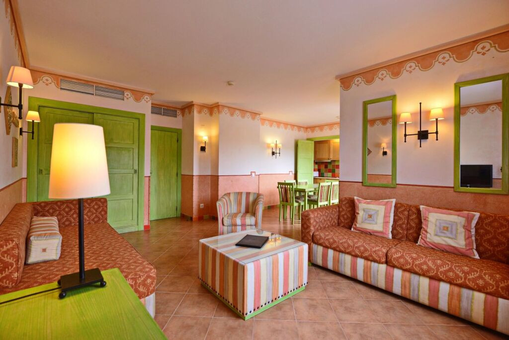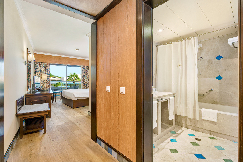 Suite Junior : Comprend une chambre avec lit double, un salon séparé, climatisation, minibar, télévision satellite, salle de bain avec baignoire, et balcon privé offrant des vues sur la mer ou le complexe.