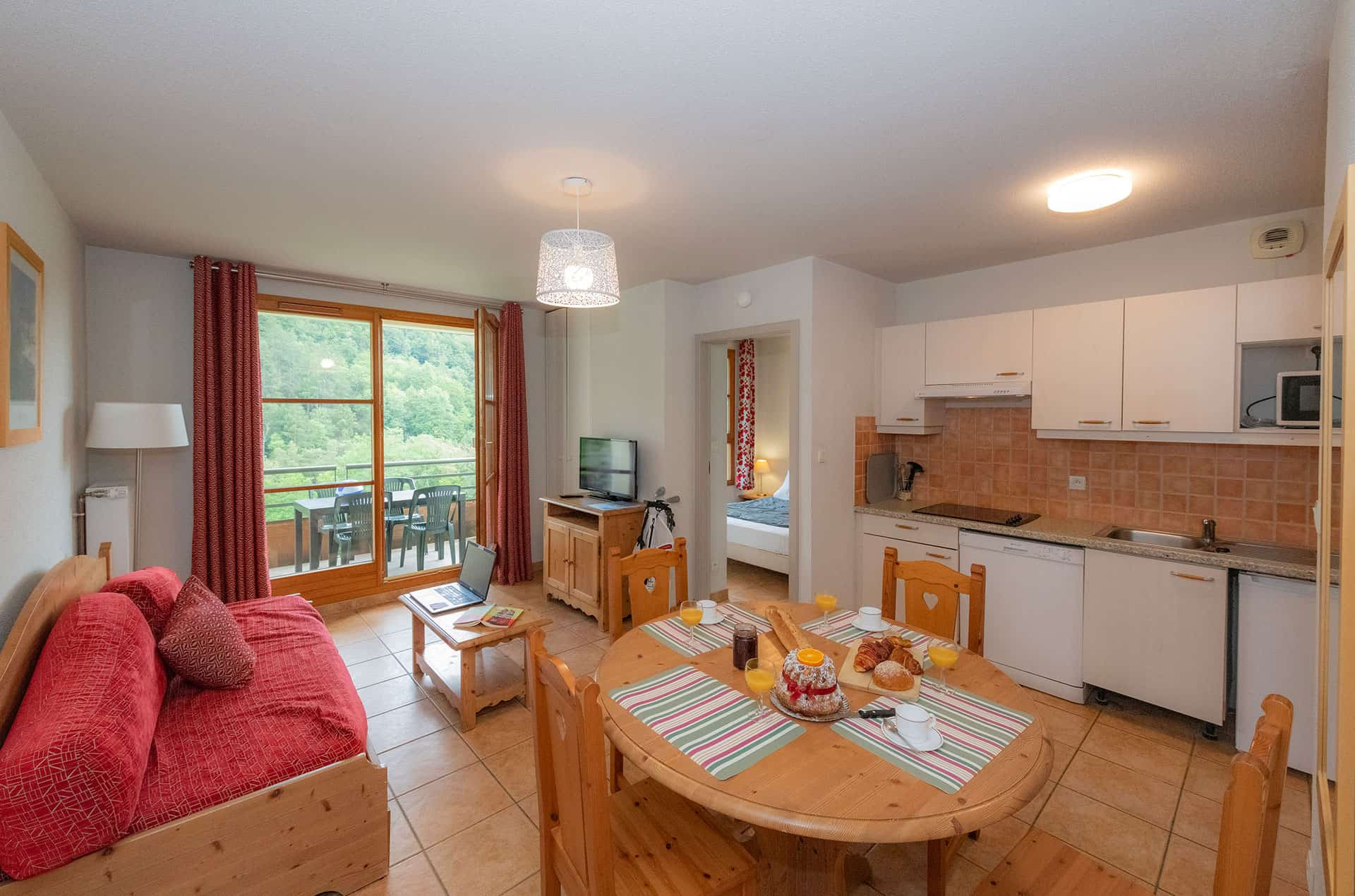 - Équipements : Une chambre séparée avec lit double, un séjour avec canapé-lit ou lits rabattables, une kitchenette équipée et un espace repas.