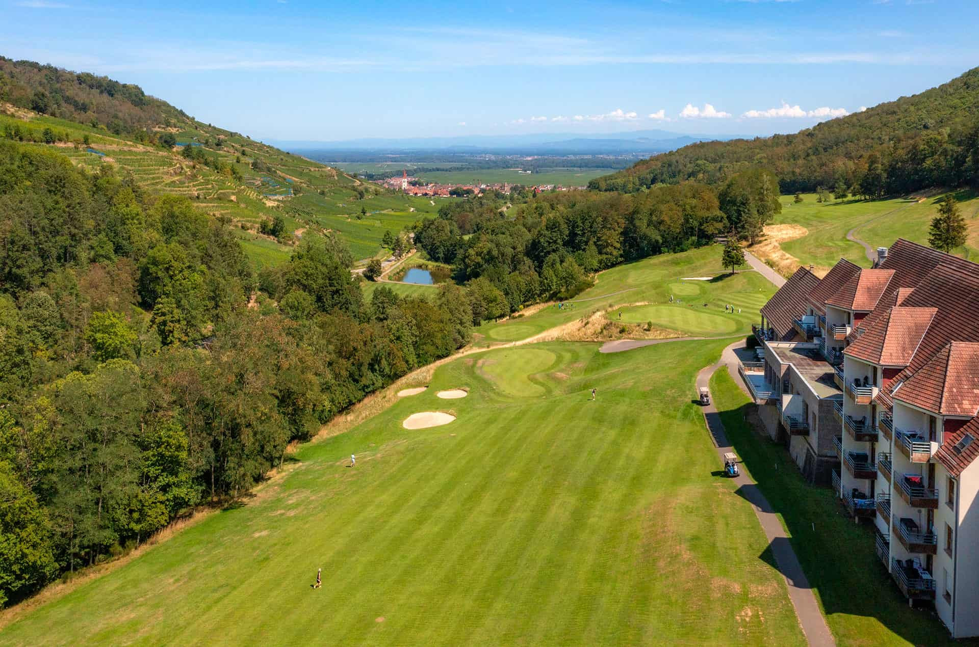 Le tracé alterne fairways sinueux, greens en surplomb et pentes naturelles qui exigent précision et maîtrise du jeu. L’environnement y est spectaculaire : on joue au milieu des coteaux viticoles, des vergers et des forêts de pins, dans une atmosphère typiquement alsacienne.