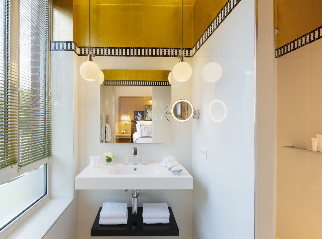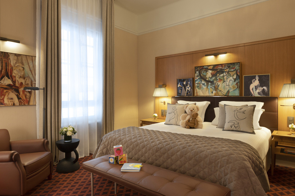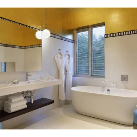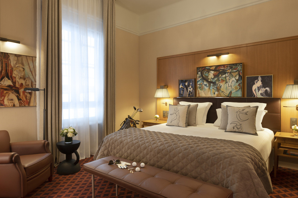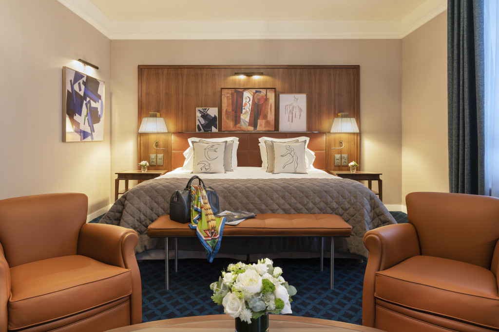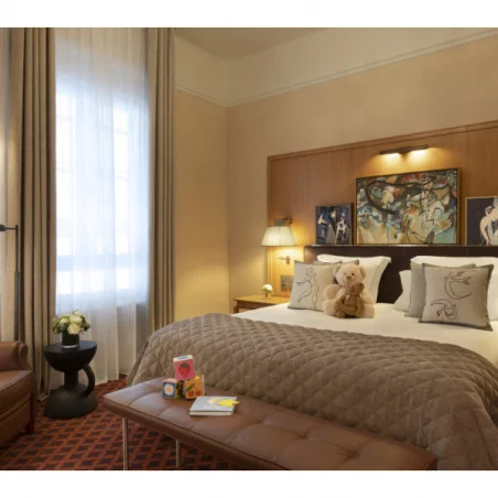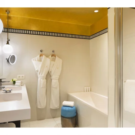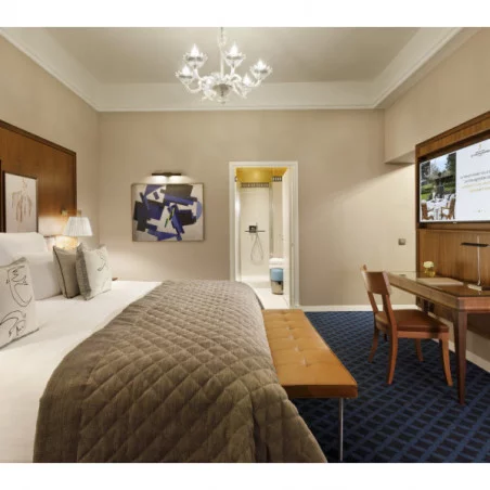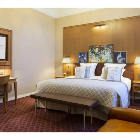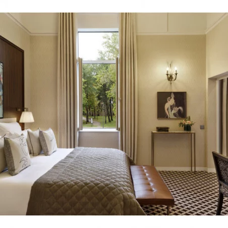 Chambre Prestige : Avec ses 35 m², cette chambre orientée plein sud offre une vue imprenable sur le Parc des Pins. Elle est dotée d'un lit king-size, d'une salle de bains avec baignoire et douche séparées, ainsi que d'un espace bureau.