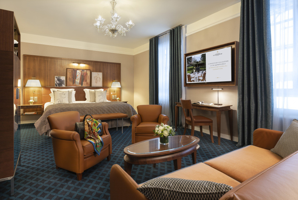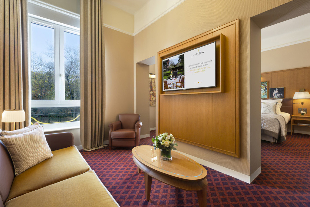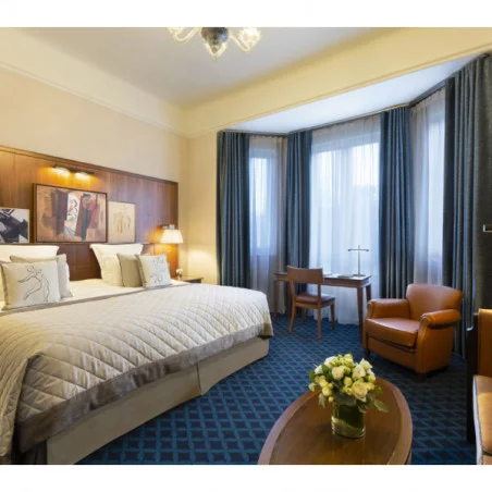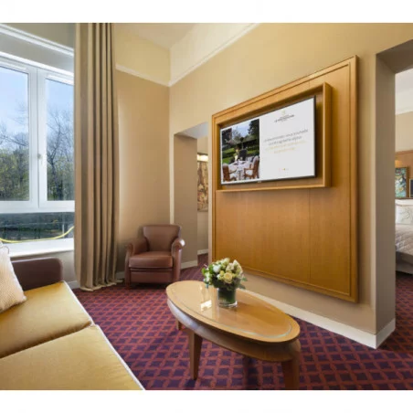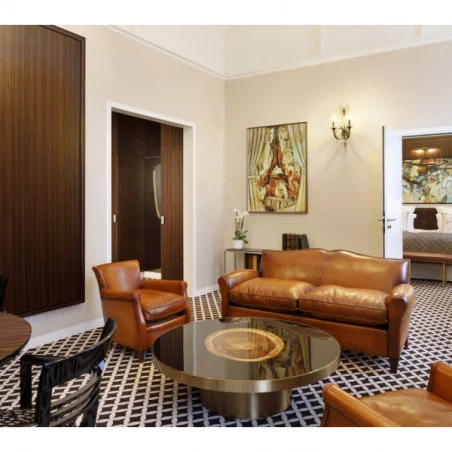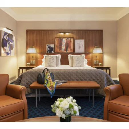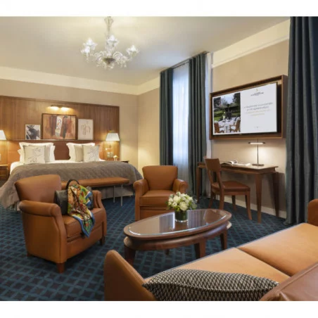 Junior Suite Prestige : Avec 48 m², cette suite spacieuse offre une vue apaisante sur le Parc des Pins. Elle dispose d'un lit king-size, d'un grand salon, d'une salle de bains luxueuse avec baignoire et douche, et de commodités haut de gamme.