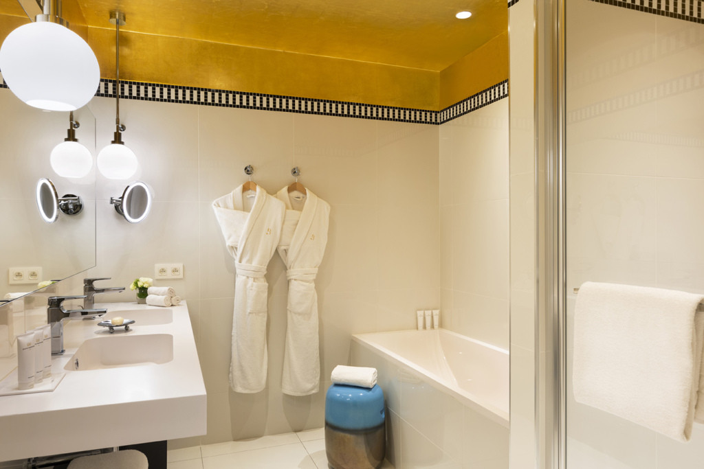 Junior Suite : D'une superficie de 40 m², cette suite élégante offre une vue sur le phare. Elle comprend un lit king-size, un coin salon séparé, une salle de bains avec baignoire et douche, ainsi que des peignoirs et chaussons pour un confort optimal.