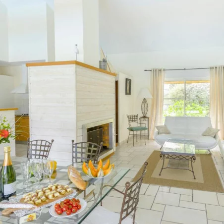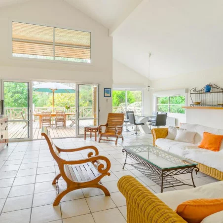 - Espaces de vie : Très grand salon avec baies vitrées donnant sur la piscine et le jardin, coin détente avec télévision et jeux de société. Salle à manger séparée.