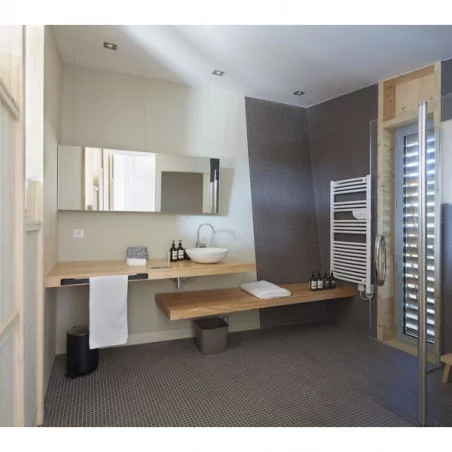 - Salle de bain avec douche, produits de soin bio, et toilette sèche ou système de recyclage de l’eau.