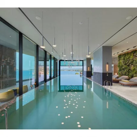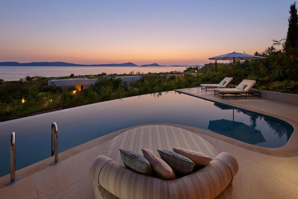 Les suites avec piscine privée ont une superficie entre 100 et 150 m² et comprennent une chambre principale, un salon séparé et un espace extérieur avec piscine privée. Elles offrent une vue sur la mer Ionienne ou les collines environnantes. Elles sont équipées d’une piscine à débordement, de chaises longues, d’un espace repas extérieur, d’une technologie dernier cri et d’un service de majordome sur demande.