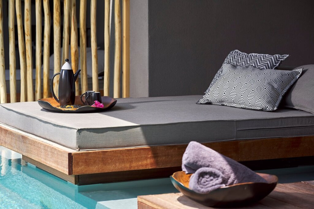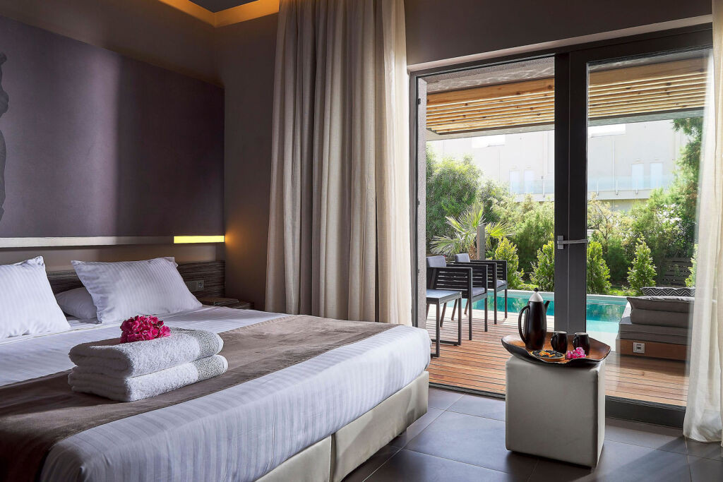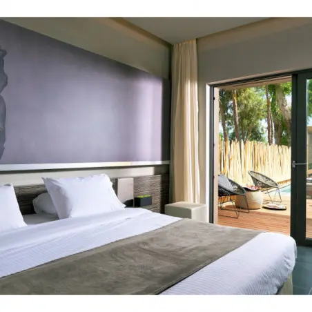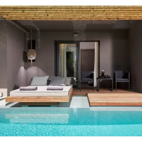 Les suites junior avec piscine privée sont équipées d’une piscine privée avec terrasse et transats, d’un coin salon avec canapé, d’un lit king-size ultra confortable, d’une salle de bain spacieuse avec double vasque et douche à l’italienne ainsi qu’un système audio Bluetooth.