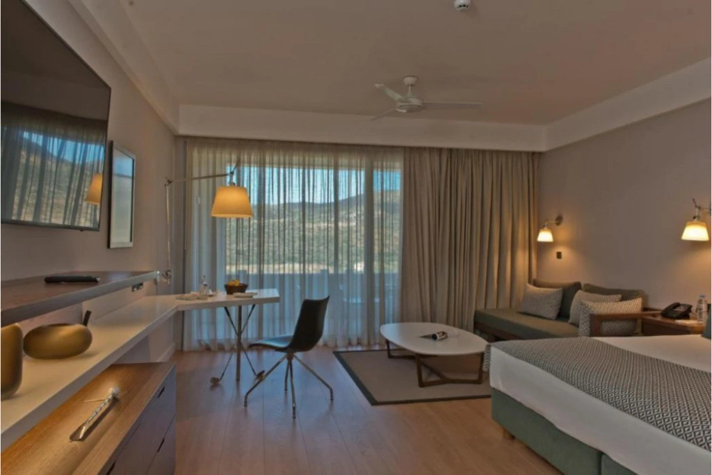 L’hôtel dispose de 23 suites de 45 m² et de 2 suites de 75 m², toutes conçues pour offrir une expérience haut de gamme. Chaque suite est équipée d’un lit king-size extra-large (210 cm x 200 cm), d’un salon avec canapé-lit, d’une salle de bain en marbre de 18 m² avec douche à l’italienne et baignoire séparée, ainsi que d’un balcon ou d’une terrasse privative avec vue spectaculaire sur le golf, la mer ou les montagnes environnantes.