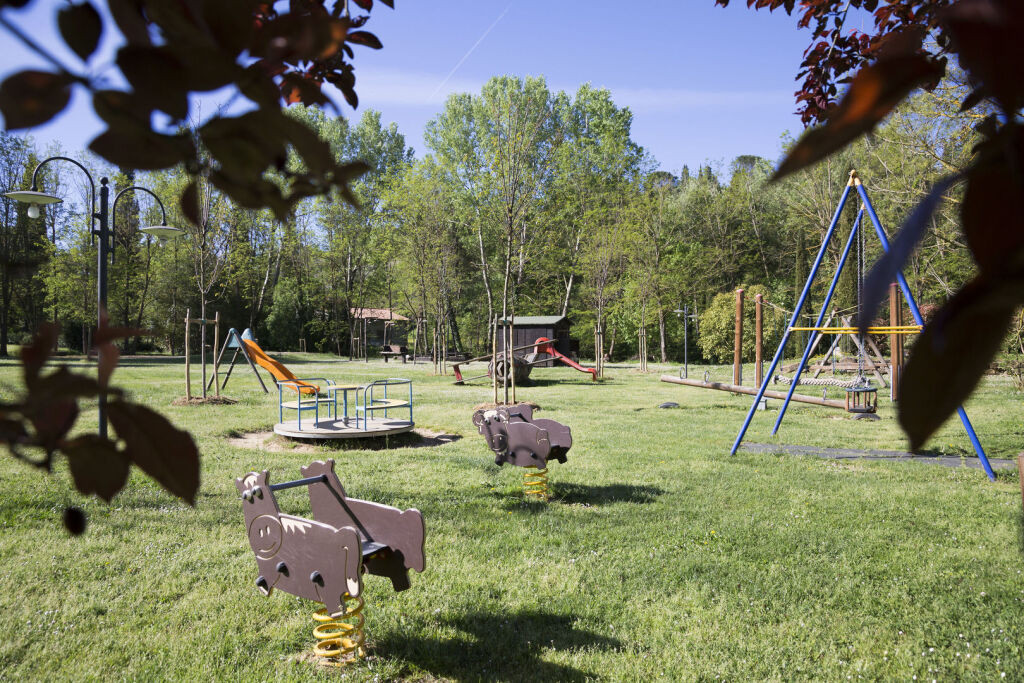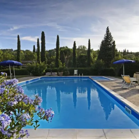 Piscines extérieures : Deux piscines, dont une dédiée aux enfants, entourées de chaises longues et de parasols pour se détendre sous le soleil toscan.
