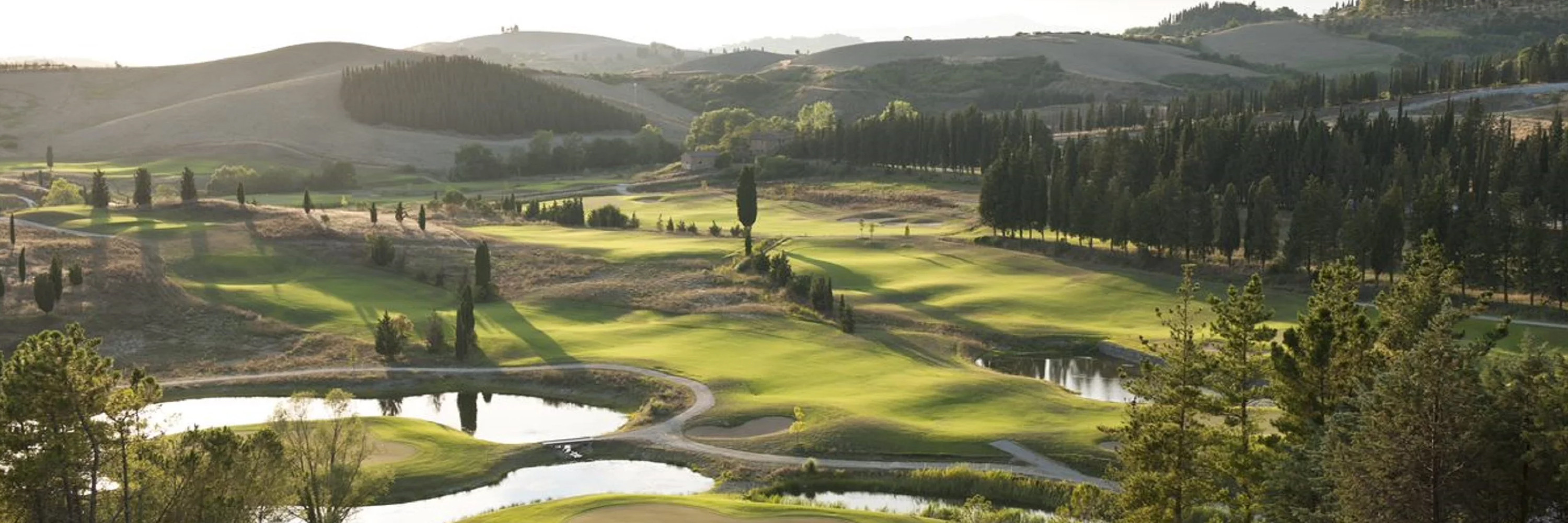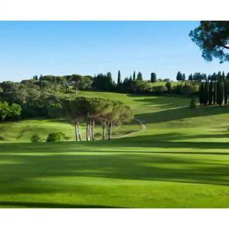 Le parcours de golf lui-même est soigneusement aménagé, avec les 18 trous disposés en cercle autour du club-house. Il est situé stratégiquement au sommet d'une colline entourée de prairies, parsemée de cyprès et de pins, offrant ainsi des vues panoramiques sur la campagne vallonnée environnante.