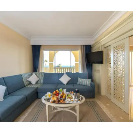 Les suites junior, d’environ 53 m², bénéficient d’un espace salon séparé, d’une vue mer ou piscine, et d’équipements supplémentaires tels qu’une machine à café et des articles de toilette premium.