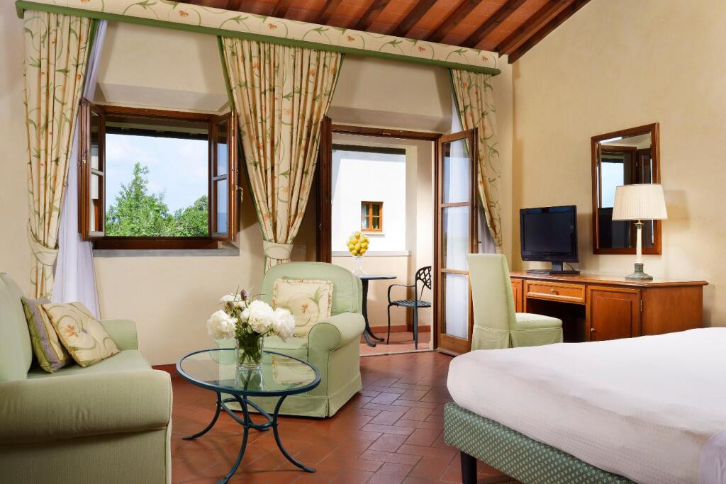 L’hôtel dispose de chambres et suites décorées dans un style chaleureux et authentique. Les poutres apparentes, les sols en terre cuite et les meubles en bois massif rappellent le caractère traditionnel de la région, tout en offrant un confort moderne. Chaque chambre bénéficie d’un balcon ou d’une terrasse privée, permettant aux clients de profiter d’une vue imprenable sur le parcours de golf ou les collines environnantes.