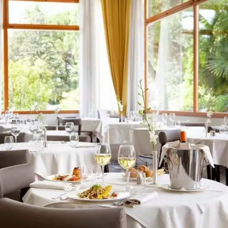 Le restaurant de l'hôtel offre une expérience culinaire raffinée avec une cuisine italienne authentique et des plats internationaux, mettant en avant des fruits de mer frais provenant directement de l'Adriatique. Les clients peuvent également profiter d'une cuisine-spectacle où les chefs préparent les plats devant eux, ajoutant une dimension interactive au repas.