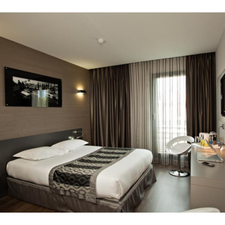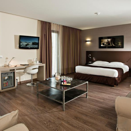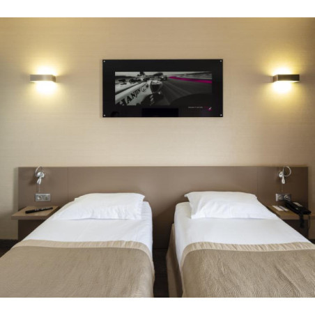 Le Grand Prix Hôtel & Restaurant propose 116 chambres Standard et une Junior Suite, toutes conçues dans un style moderne avec des touches inspirées du monde automobile. Chaque chambre, lumineuse et climatisée, est équipée d’une télévision à écran plat, d’un minibar gratuit, d’un coffre-fort, d’une connexion Wi-Fi gratuite et d’une salle de bains privative avec douche. La Junior Suite, avec sa terrasse spacieuse, offre un confort raffiné pour une expérience plus exclusive. Les tons taupe, beige et gris créent une ambiance apaisante, parfaite pour se détendre après une journée trépidante.