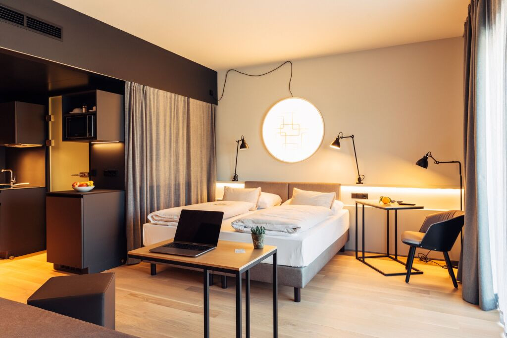 Les logements du harry’s home Telfs sont spacieux, lumineux et fonctionnels. Selon les besoins, les clients peuvent choisir entre des chambres standard ou des studios avec cuisine. L’aménagement modulable permet d’adapter l’espace à chaque type de séjour. Tous les hébergements disposent du Wi-Fi gratuit, de la climatisation, d’un espace de travail et d’une literie de qualité. Certaines chambres offrent une vue sur les montagnes tyroliennes, ajoutant une touche de nature à l’expérience.