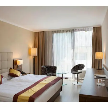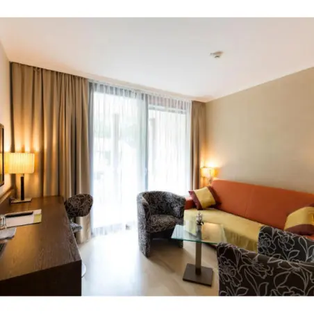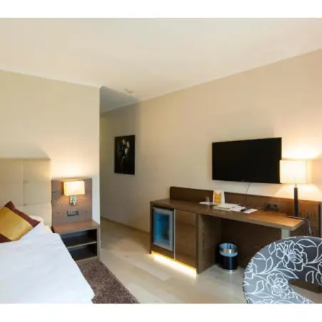 L’hôtel propose des chambres et suites spacieuses, décorées dans un style classique avec des matériaux de qualité. Certaines offrent une vue magnifique sur le parc ou les collines environnantes. L’atmosphère y est chaleureuse et feutrée, propice au repos après une journée de découvertes ou de golf. Les chambres sont toutes équipées d’une literie haut de gamme, de la climatisation, d’une télévision, du Wi-Fi gratuit et d’une salle de bains moderne.
