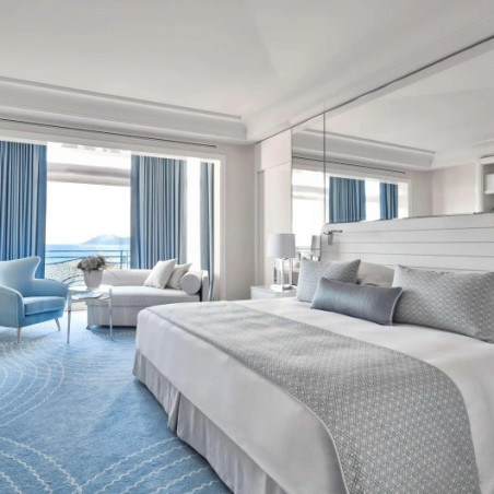 Avec ses 409 chambres et suites, l’hôtel propose un large choix d’hébergements élégants, modernes et raffinés. Certaines chambres offrent une vue spectaculaire sur la baie de Cannes et la Méditerranée. Récemment rénovées, elles sont décorées dans un style chic mêlant matériaux nobles et design contemporain, garantissant un confort optimal. Les suites disposent de vastes espaces, de terrasses privées et de prestations haut de gamme pour un séjour tout en luxe et en intimité.