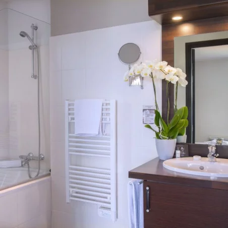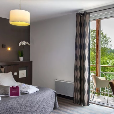 La chambre prestige est encore plus luxueuse, avec une salle de bain privée comprenant une baignoire et une douche séparées, un lit king-size, minibar, peignoirs, chaussons et vue panoramique sur le golf ou la rivière.