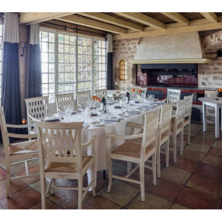 Côté services : un vaste jardin, une piscine extérieure saisonnière chauffée, un spa avec massages panoramiques, outdoor fitness, sauna, et équipements pour bien-être. L’hôtel propose également deux restaurants : le bistrot « L’Ardoise » sur terrasse, et le gastronomique « La Table de l’Abbaye » dans la chapelle romane, avec cuisine locavore et vue sur la nature environnante.
