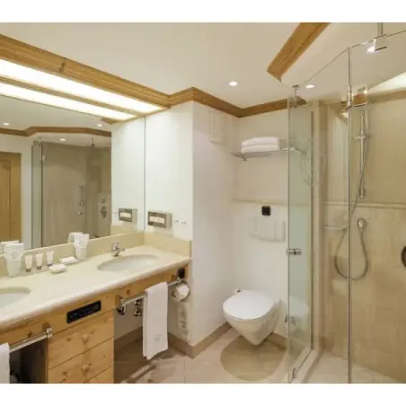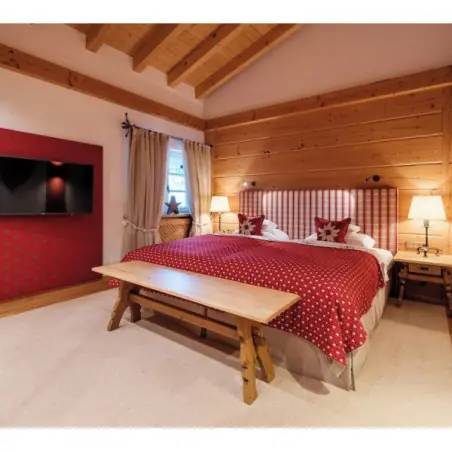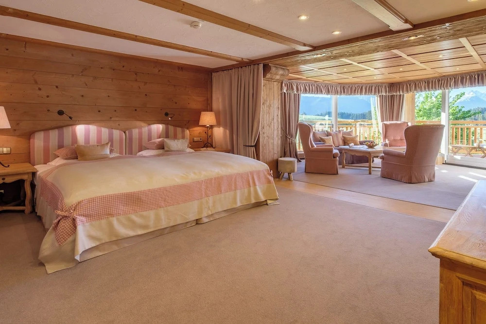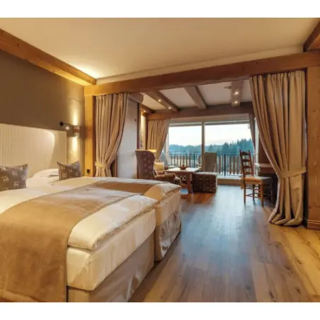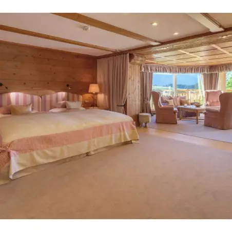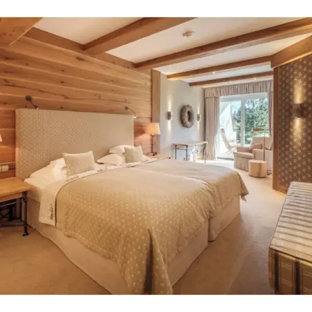 L’hôtel dispose de 218 chambres et suites, toutes décorées avec élégance et chaleur alpine. Les boiseries naturelles, les tissus nobles et les luminaires doux créent une atmosphère apaisante.