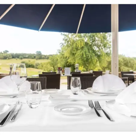 La terrasse panoramique surplombant le parcours est le lieu parfait pour un déjeuner après le golf ou un dîner romantique au crépuscule.