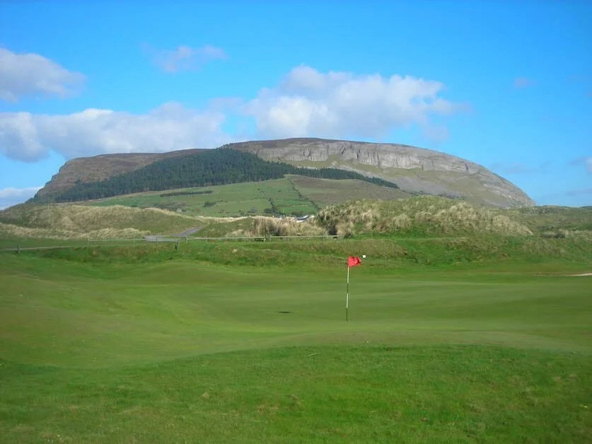 Le trou n°5, signature du parcours, surplombe l’Atlantique et offre une vue spectaculaire sur Knocknarea Mountain et la baie de Sligo.