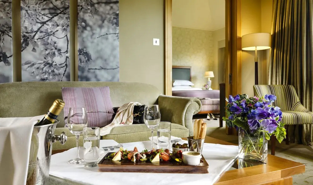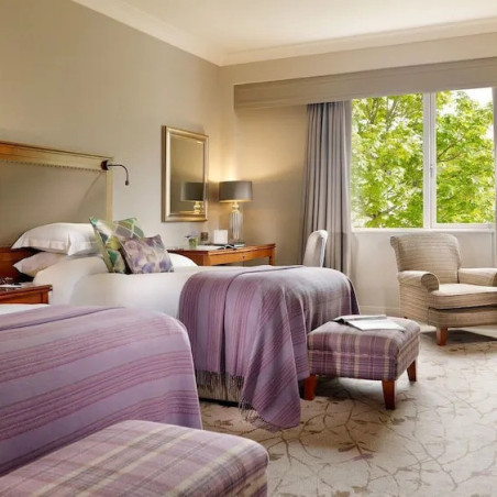 L’hôtel du Druids Glen Golf Resort propose des chambres et suites élégantes, alliant confort moderne et charme classique. Les espaces sont lumineux, calmes et parfaitement intégrés à l’environnement naturel. Le resort dispose également d’un spa haut de gamme, d’espaces bien-être, d’une piscine intérieure et d’une offre gastronomique raffinée mettant en valeur les produits irlandais de saison. L’atmosphère y est paisible et exclusive, idéale pour se détendre après le golf.