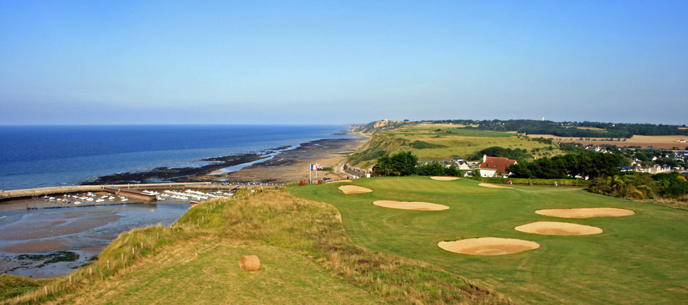 Le cadre, sur le green du trou 6, est grandiose. Posé au bout de la falaise par Yves Bureau, l’architecte, il surplombe la ville de Port-en-Bessin et ses bateaux, il offre un panorama sur le port artificiel d’Arromanches, sur les batteries de canons de Longues-sur-Mer, vestiges encore très présents du Débarquement.